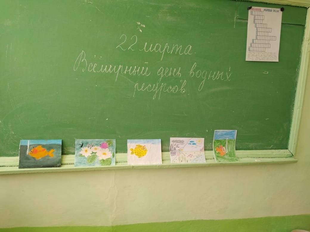 22 марта в школе прошли мероприятия, посвящённые Международному дню водных ресурсов, с целью экологического воспитания подрастающего поколения; расширения кругозора школьников. Учитель биологии рассказала ребятам, что « Международный день водных ресурсов » был создан 1993 году Генеральной Ассамблеей ООН. Наша планета Земля – планета воды: более ¾ занимают воды океанов, морей, озёр, рек, льдов, но мировые запасы пресной воды ограничены, а потребление постоянно растёт.